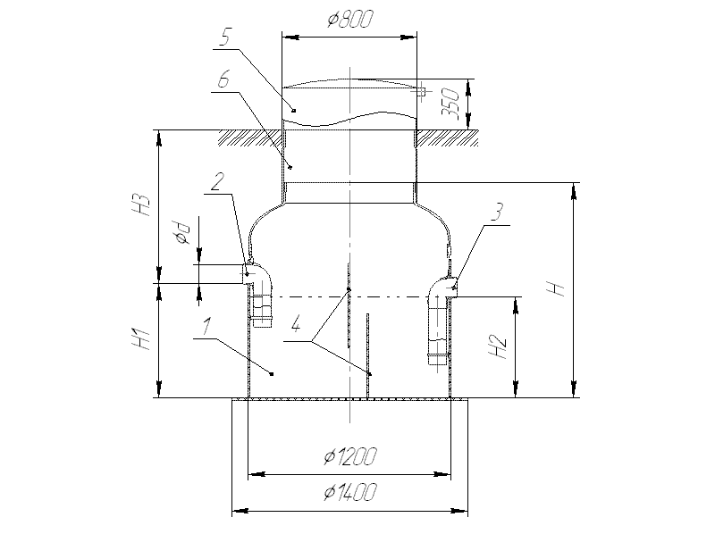 Описание: 1. Корпус; 2. Патрубок входной; 3. Патрубок выходной; 4. Перегородка; 5. Люк; 6. Колодец технический.